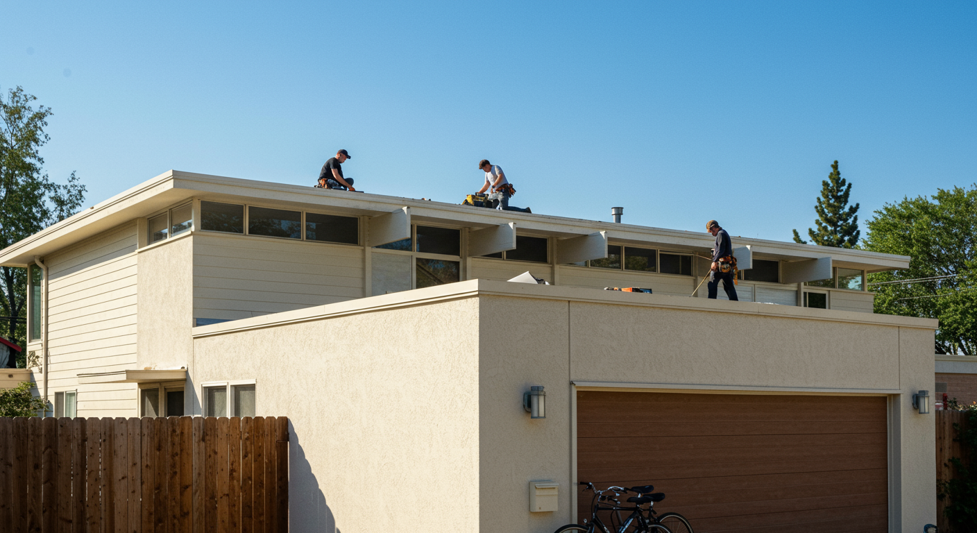 Pros: Since single plies are highly reflective which means they reduce heat gain and have a proven ability to withstand ultraviolet rays from the sun. While some homeowners opt for installation without additional insulation, others prefer it to gain cold-weather protection. It’s also energy efficient due to its light color and reflectivity, which can lead to potential HVAC savings and a more environmentally friendly solution. Since the lightweight materials make it cleaner and much easier for contractors to install, it tends to be an affordable option for homeowners.