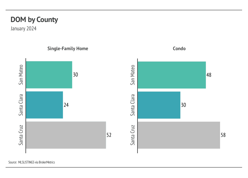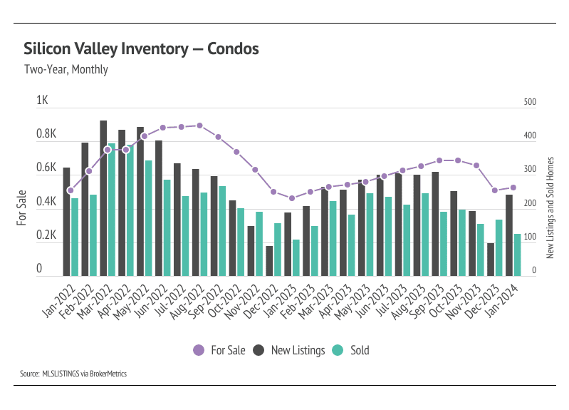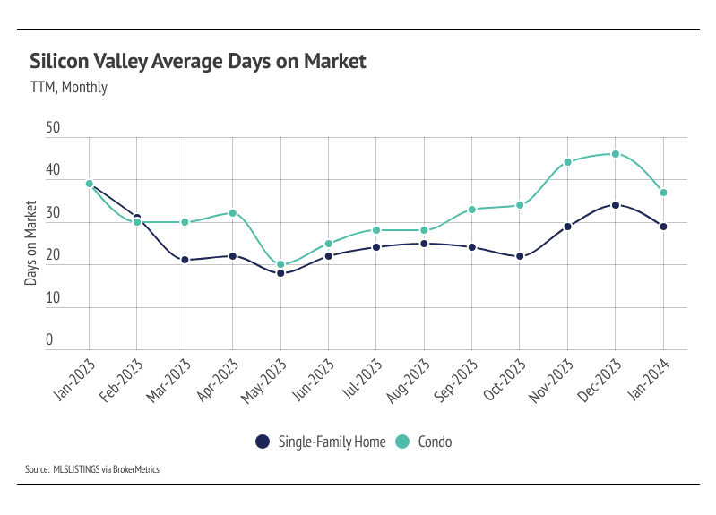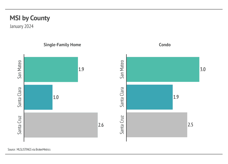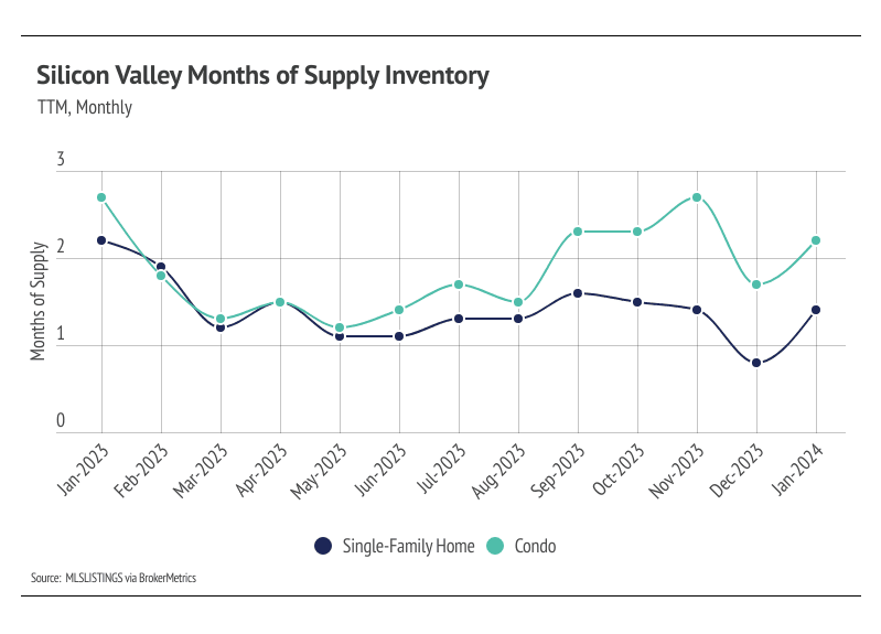 Months of Supply Inventory (MSI) quantifies the supply/demand relationship by measuring how many months it would take for all current homes listed on the market to sell at the current rate of sales. The long-term average MSI is around three months in California, which indicates a balanced market. An MSI lower than three indicates that there are more buyers than sellers on the market (meaning it’s a sellers’ market), while a higher MSI indicates there are more sellers than buyers (meaning it’s a buyers’ market). The Silicon Valley market tends to favor sellers, which is reflected in its low MSI. MSI fell sharply in the first quarter of 2023 before gently trending higher from May to November. In December, MSI declined sharply, but rose again in January. Currently, the Silicon Valley market favors sellers for single-family homes and condos.