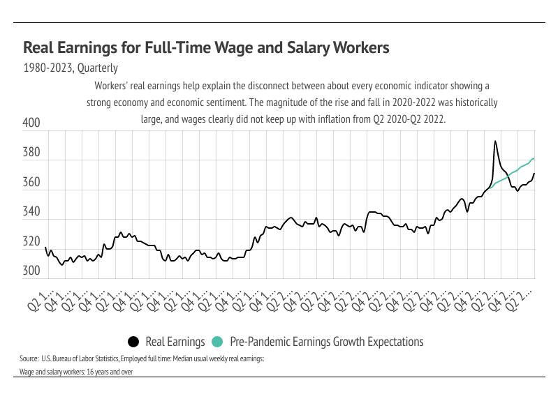 Another important aspect of the current market is the very recent positive changes in workers’ real earnings. The psychological effects of nearly 10 years of earnings growth, culminating in a final jump in the first two quarters of 2020, before dropping rapidly once COVID hit and inflation rose, was perhaps the most significant cause of the low economic sentiment in 2022 and most of 2023. People quickly become attached to the amount of money they make and the spending power of that money, so the feeling that it was taken away creates dissatisfaction. It’s also fair to say that part of the American dream is progressively increasing earnings as we age. But earnings didn’t keep up with inflation, so real earnings dropped, causing even more dissatisfaction. From 2021 to 2023, the purchasing power of the U.S. dollar declined 15%; therefore, earnings needed to increase 15% just to feel as financially well off as three years prior. For many, if not most people, earnings weren’t keeping up with inflation, and people don’t tend to buy homes when they feel less wealthy. However, after six straight quarters of real earnings growth, it makes sense that people broadly feel better about their finances, which will only benefit the housing market.