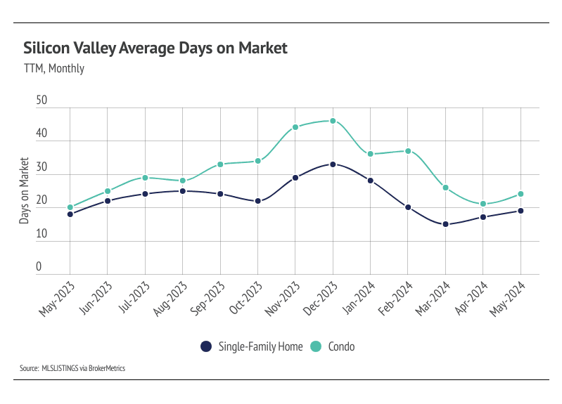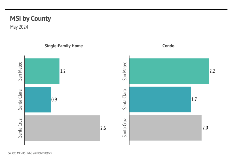 Months of Supply Inventory (MSI) quantifies the supply/demand relationship by measuring how many months it would take for all current homes listed on the market to sell at the current rate of sales. The long-term average MSI is around three months in California, which indicates a balanced market. An MSI lower than three indicates that there are more buyers than sellers on the market (meaning it’s a sellers’ market), while a higher MSI indicates there are more sellers than buyers (meaning it’s a buyers’ market). The Silicon Valley market tends to favor sellers, which is reflected in its low MSI. MSI trended higher in the second half of 2023, but never climbed above three months of supply. From January to April 2024, single-family home and condo MSI fell significantly, indicating the housing market strongly favors sellers.