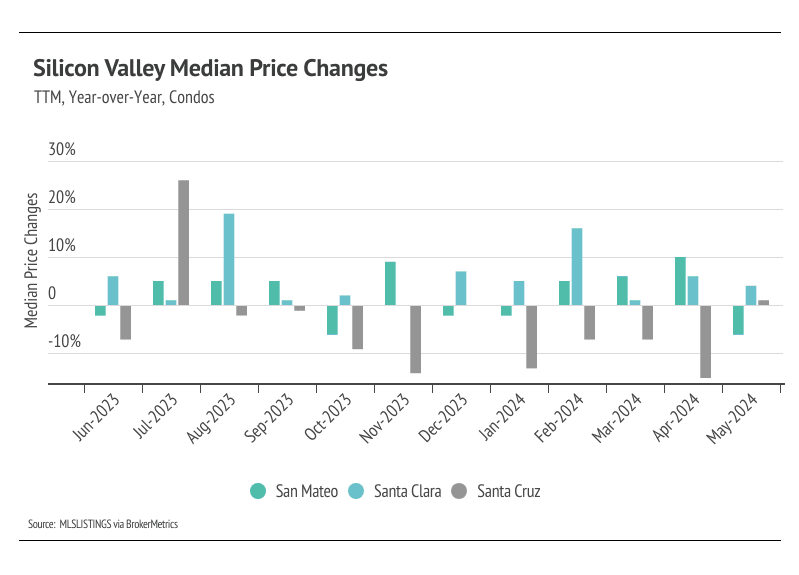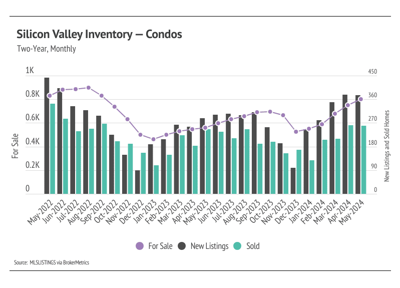 In Silicon Valley, low inventory and high demand have more than offset the downward price pressure from higher mortgage rates. Home prices haven’t been largely affected by rising mortgage rates after the initial period of price correction from May 2022 to January 2023. In 2023, prices trended horizontally, but in 2024, prices have begun to rise meaningfully. Month over month, in May, the median single-family home price rose 12% in San Mateo and 5% in Santa Clara, but fell 5% in Santa Cruz. Conversely, condo prices fell slightly month over month across Silicon Valley. We expect prices in Silicon Valley to remain at or near peak until the early summer. Low, but rising inventory is buoying prices as buyers are better able to find the best match.