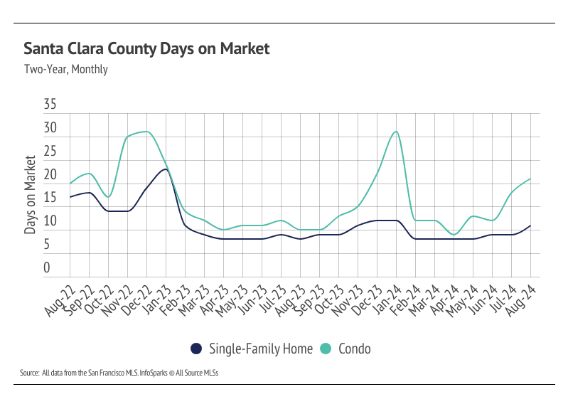 In Santa Clara, home prices haven’t been largely affected by rising mortgage rates after the initial period of price correction from April 2022 to December 2022. Since December 2022, the median single-family home price has trended higher, while condo prices have trended horizontally. Year over year, the median price was up 0.3% for single-family homes and down 7% for condos. Single-family home prices peaked in May 2024 and has since declined 11%. Prices are more likely to rise if more sellers come to the market. Inventory is so low that rising supply will only increase prices as buyers are better able to find the best match. More homes must come to the market to get anything close to a healthy market. That said, inventory, sales, and price typically peak in the first half of the year, so we expect contraction across those metrics for the rest of the year. Inventory is still low enough that it should create price support as supply declines in the second half of the year.