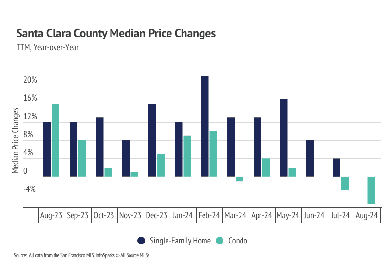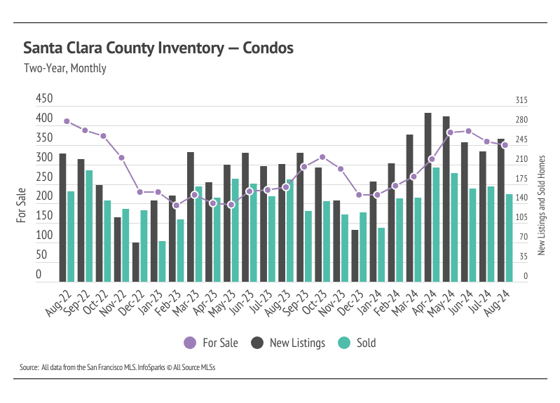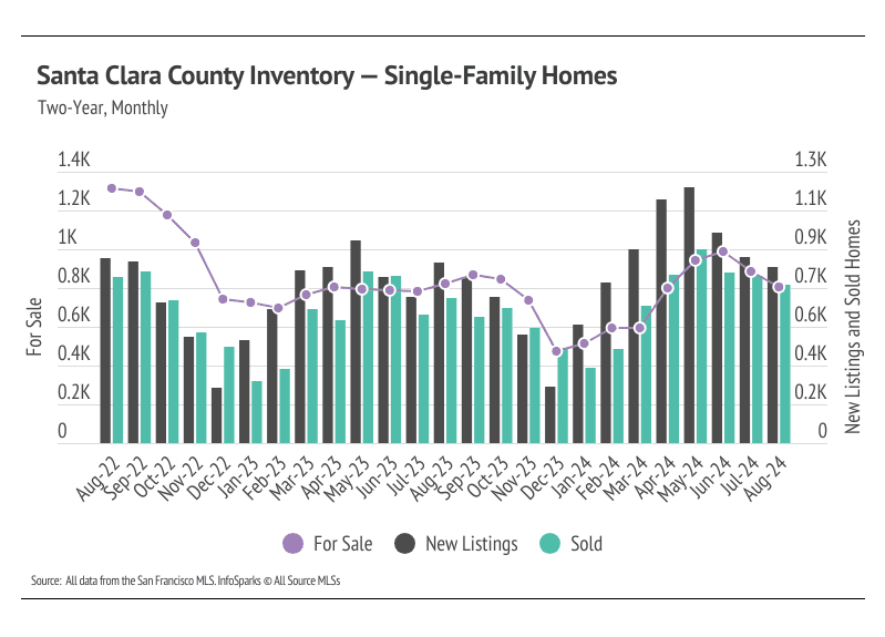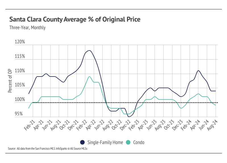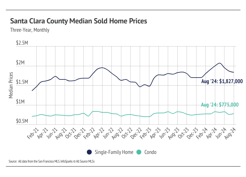 In August, inventory and new listings declined, which is normal for this time of year, while home sales rose. Compared to this time last year, inventory has increased significantly, up 10%. Sales are up 9% for single-family homes, but condo sales declined 13%. Any amount of increasing inventory is good for the Santa Clara market. Inventory still has a long way to go before the market begins to become more balanced. When we take a longer look back and compare the supply of homes in August 2019 (pre-pandemic) to now, active listings have decreased by 62%. With that in mind, it’s actually quite impressive that sales have only declined by 18%.